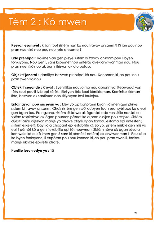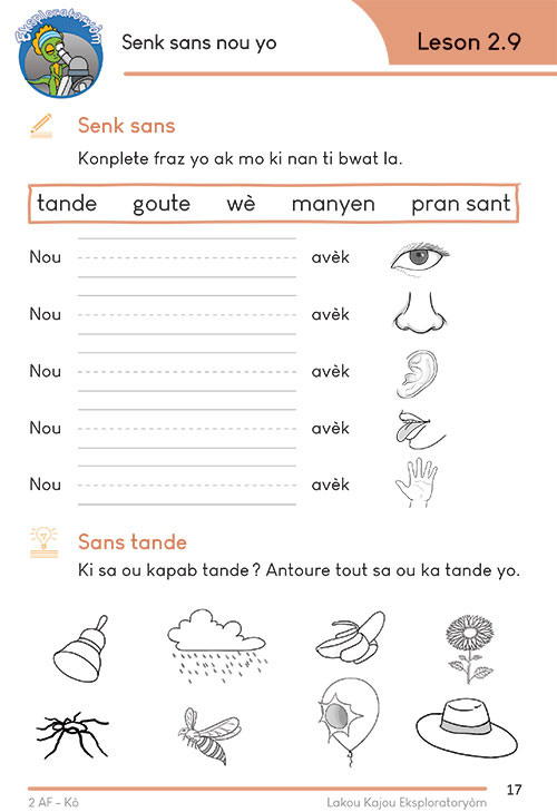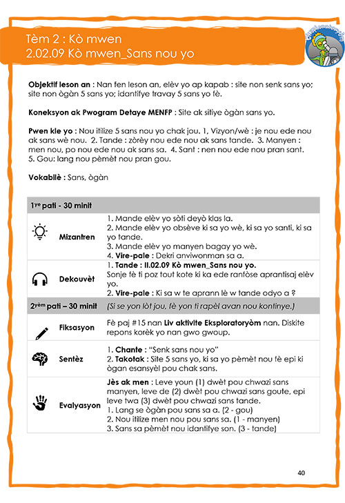Not only is the Eksploratoryòm aligned with the MENFP‘s first and second-grade science curriculum, it also offers connections to the Kreyòl language development objectives of communication, reading, writing, vocabulary, and spelling.
